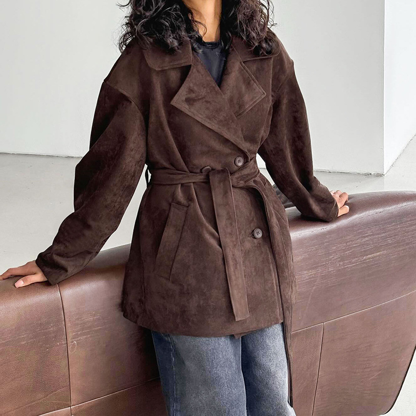 Retro brown suede jacket lace-up coat for women design sense temperament fashion year
