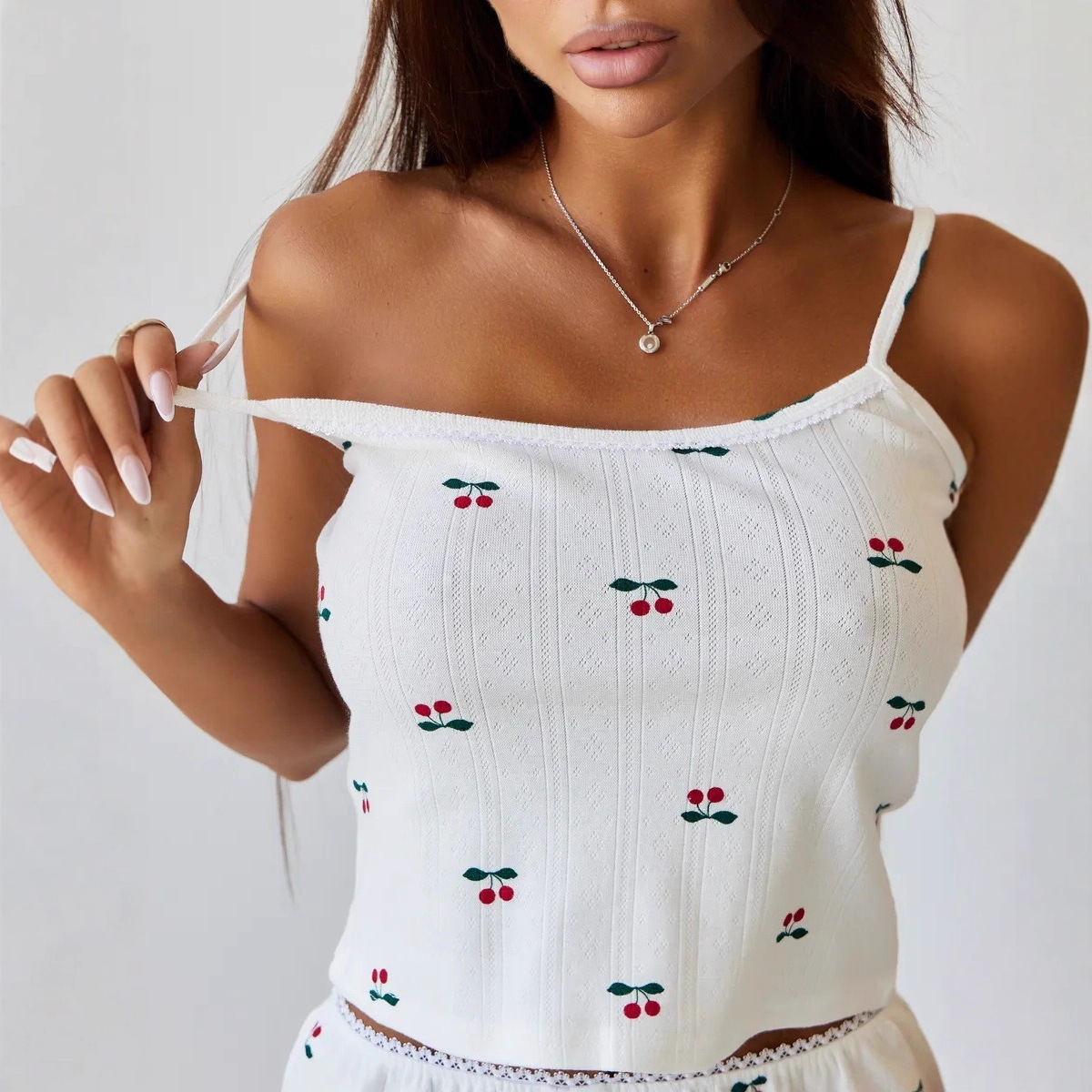 Cherry print pajamas suspender shorts casual girly style cute loose and comfortable women’s home wear set