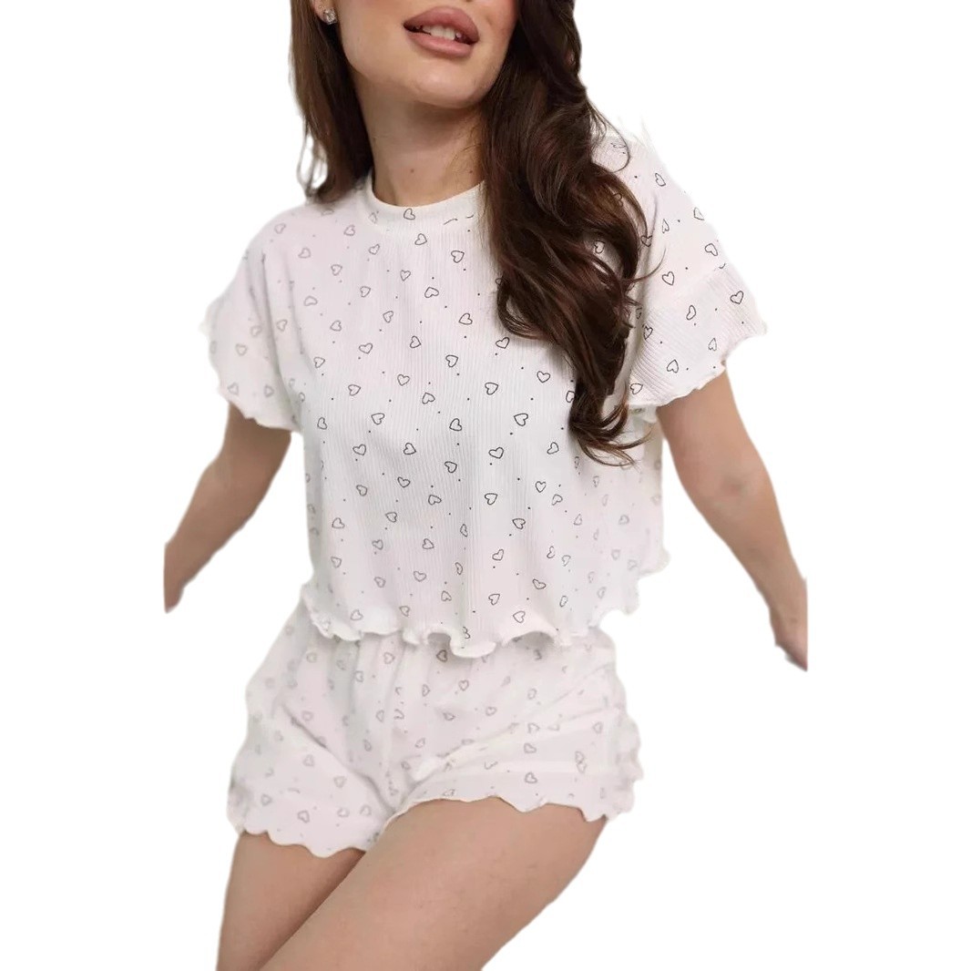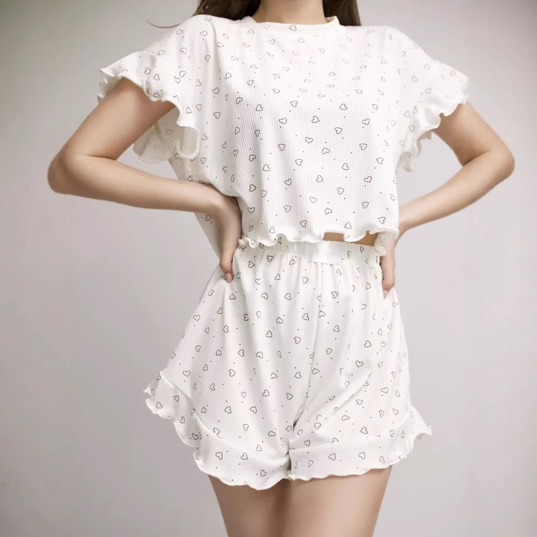 Fashionable love print ruffle suit ribbed short-sleeved shorts two-piece set women’s pajamas home wear