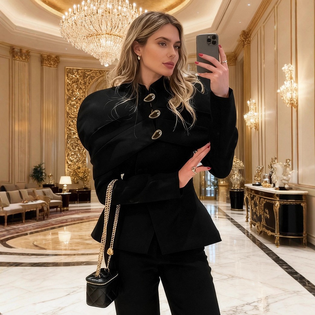 Clothes length: Ordinary (50c Sleeve length: long sleeves Sleeve type: Regular sleeve Collar type: Stand collar Popular elements: buttons year season: Winter 2025 color: Black, weight L: 491G, composition: 95% polyester fiber, 5% spandex, support size: S,,L style type: Temperament commuting placket: single breasted style type: Elegant temperament Whether: Yes Get the bid: No collar bid Type: Hang tag: No tag Main downstream sales areas 1: Main downstream sales areas 2: