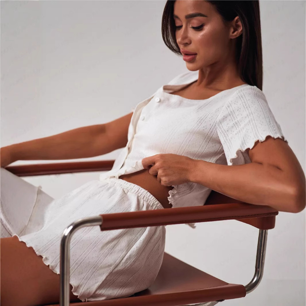 Hollow Solid Color Short Sleeve Suit Round Neck Button Cardigan Top Fungus Trimmed Home Clothes Two-piece Set for Women