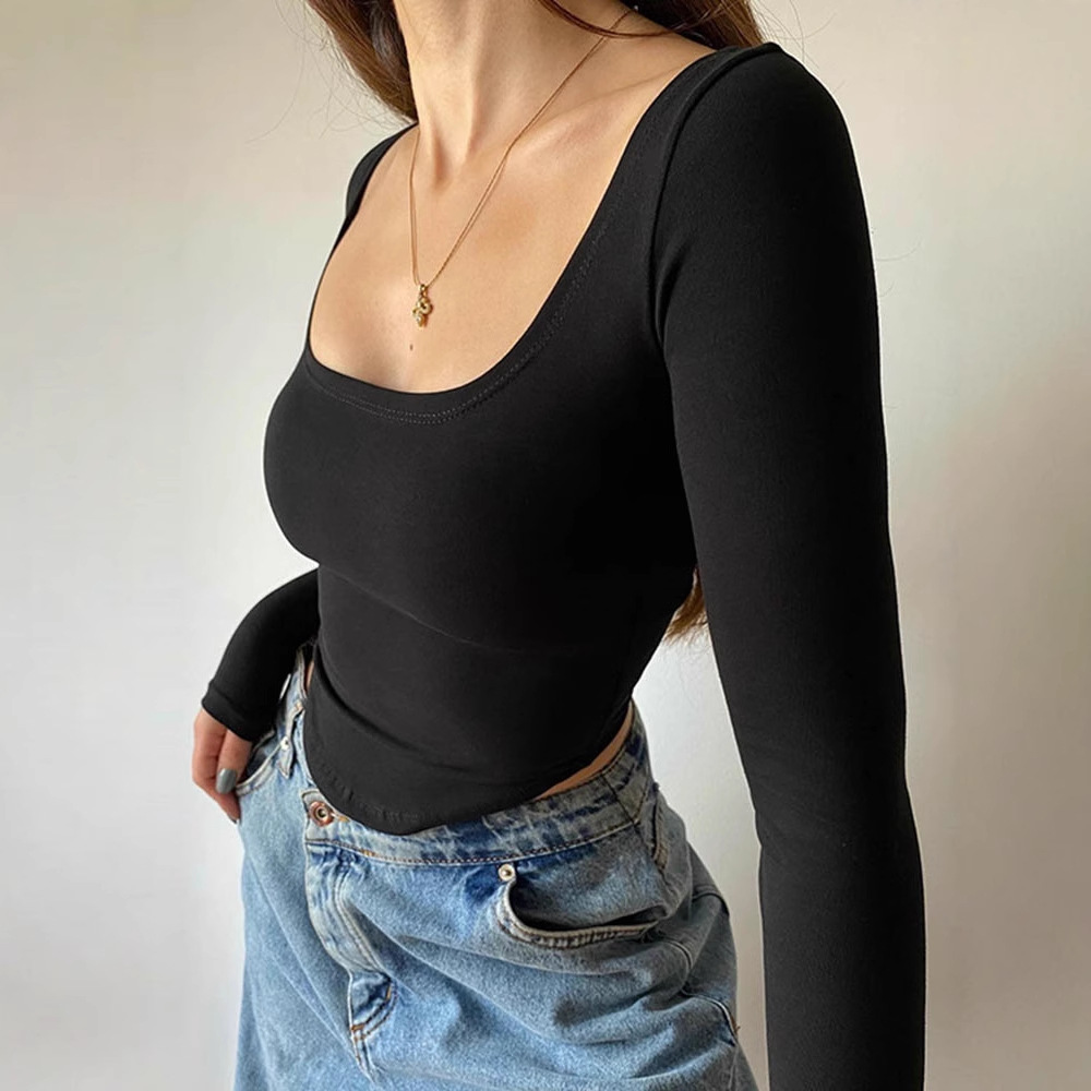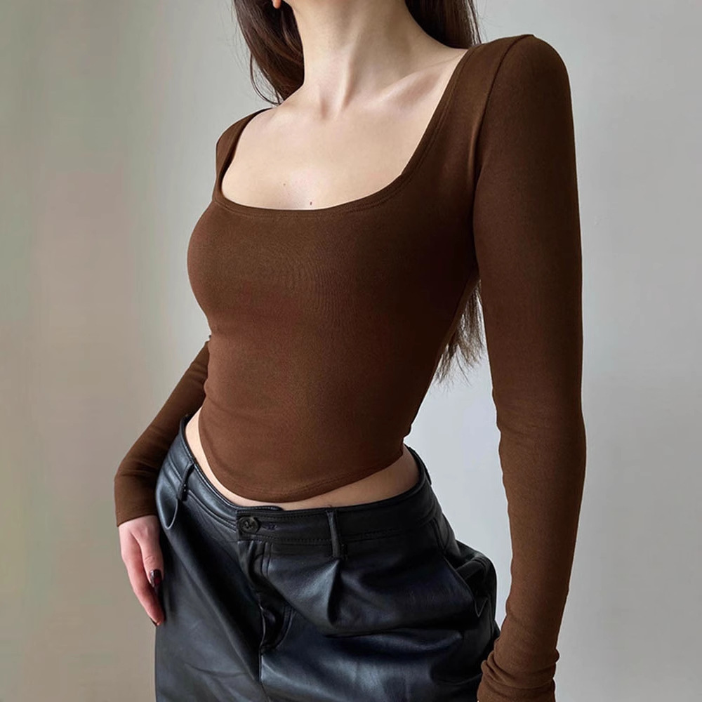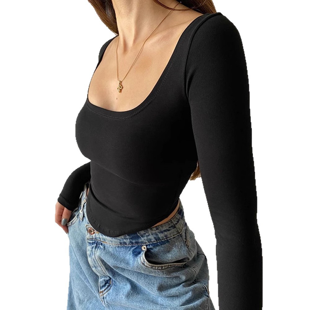 Modal cotton square collar long-sleeved inner shirt for women sexy midriff-baring slim fit short top