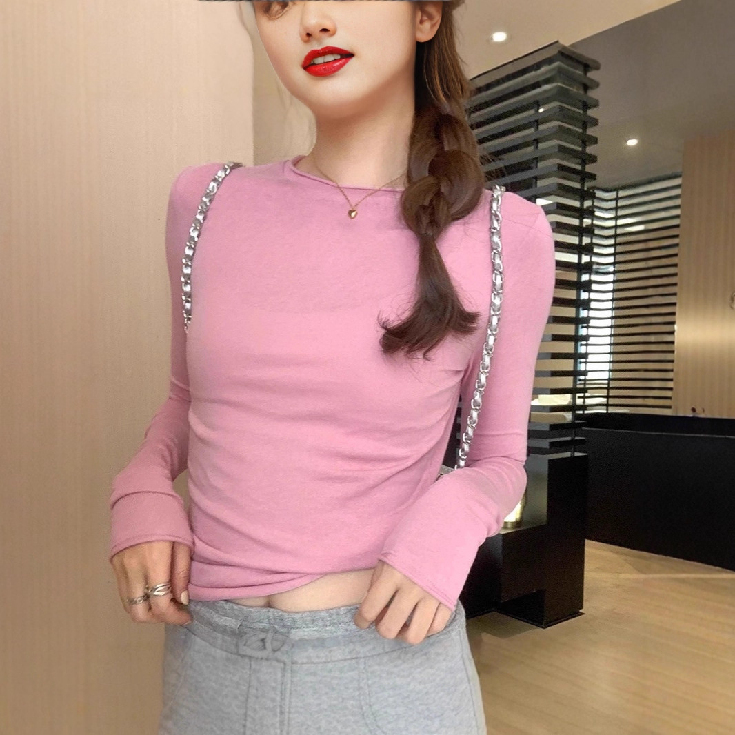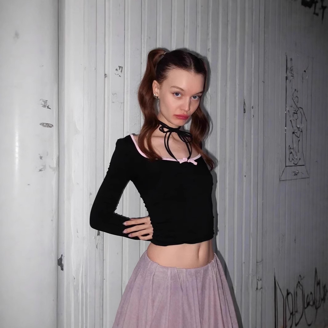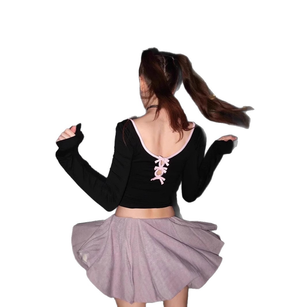 Be the first to review “Pure lust style round neck bow design pleated waist long-sleeved shirt bottoming shirt slim hot girl navel top women”