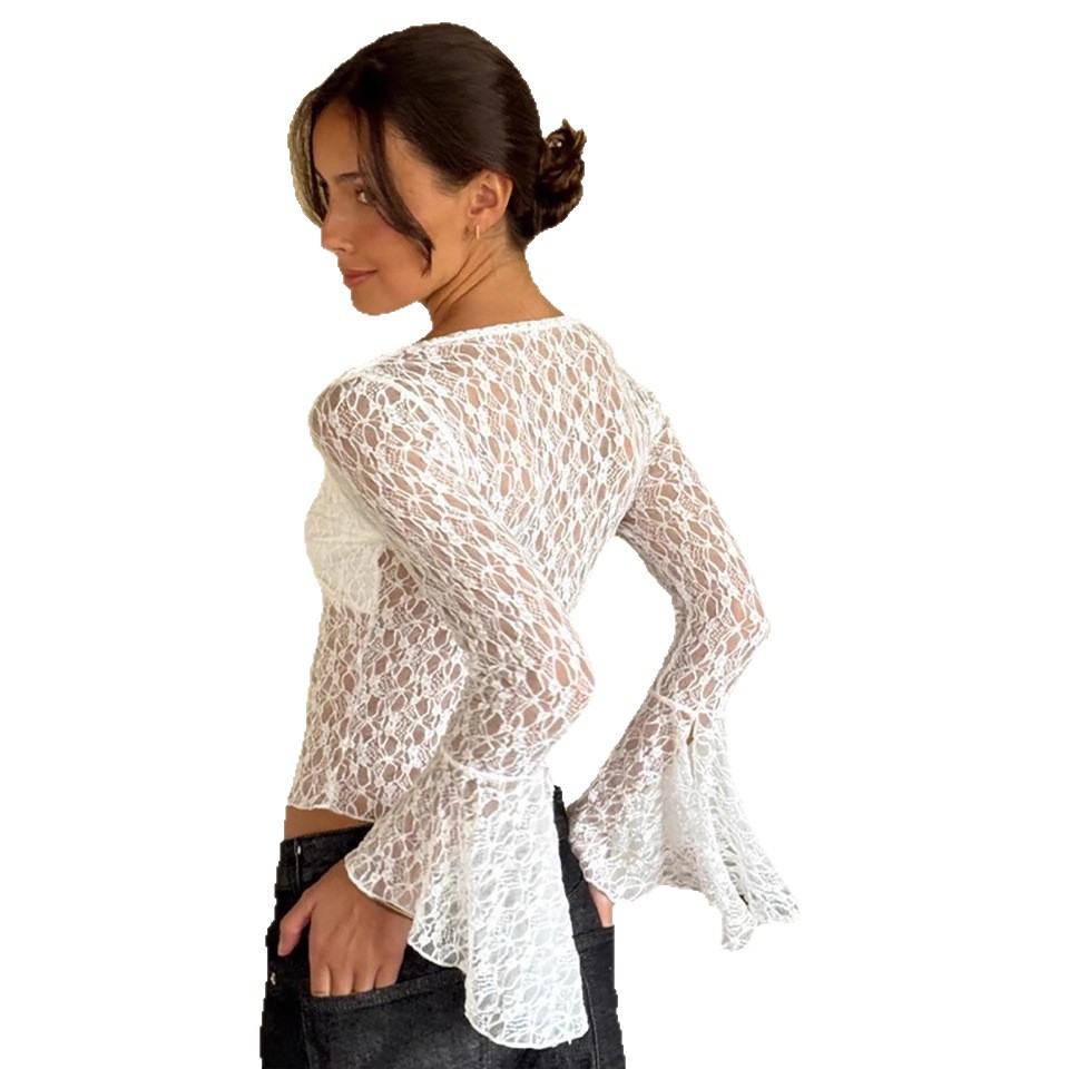 Pure lust style slightly see-through collar trumpet long-sleeved lace shirt for hot girls to expose her navel and wear a bottoming shirt top