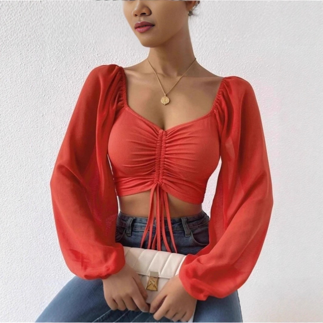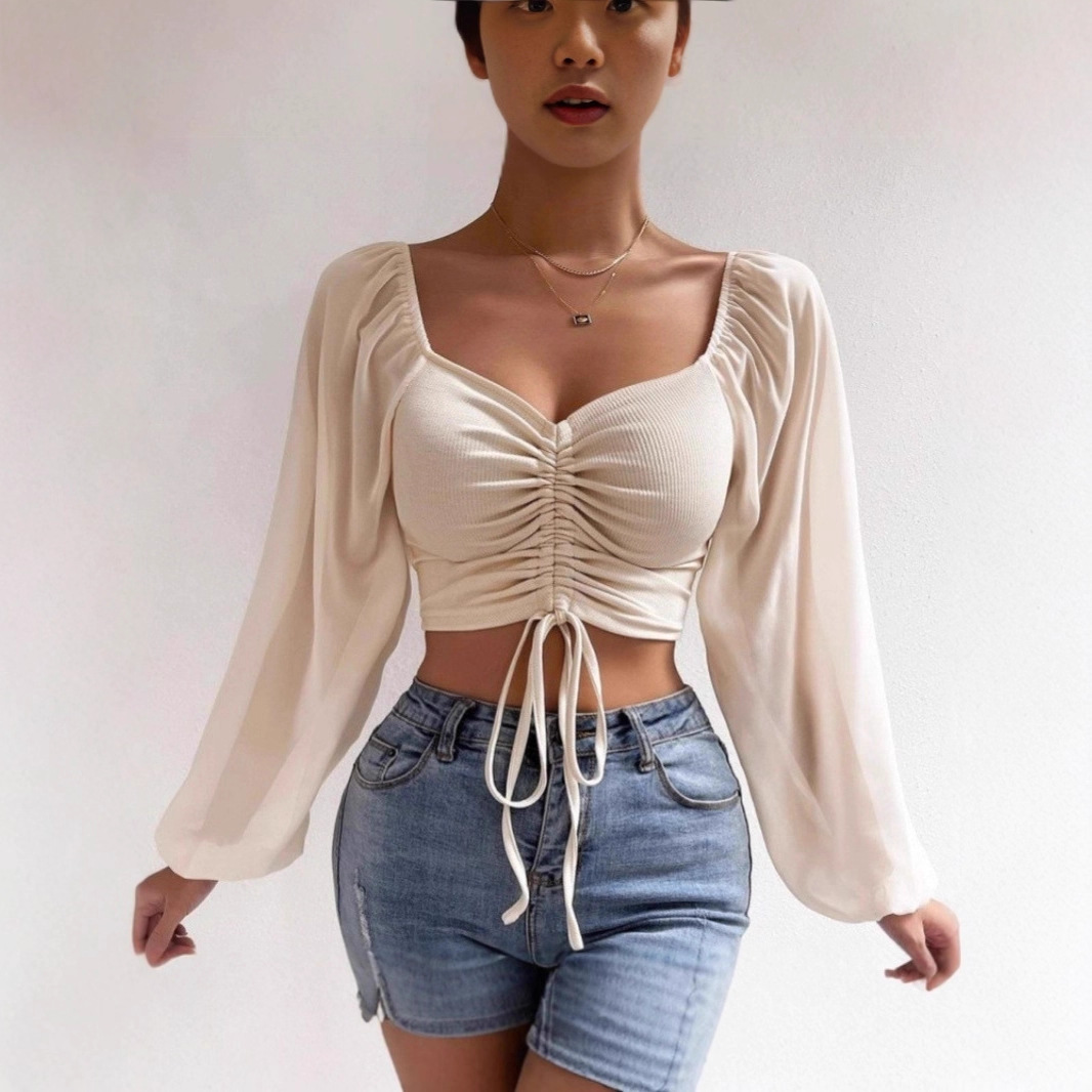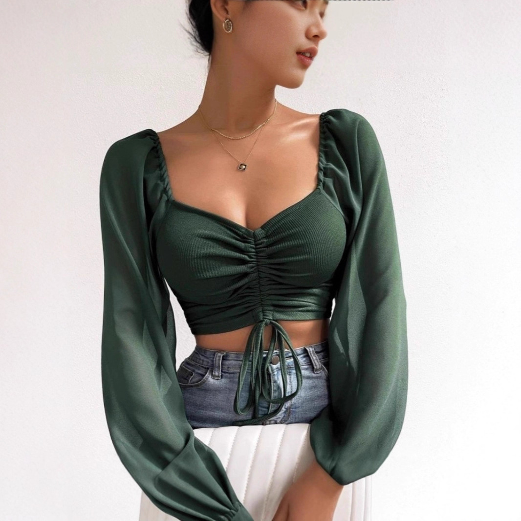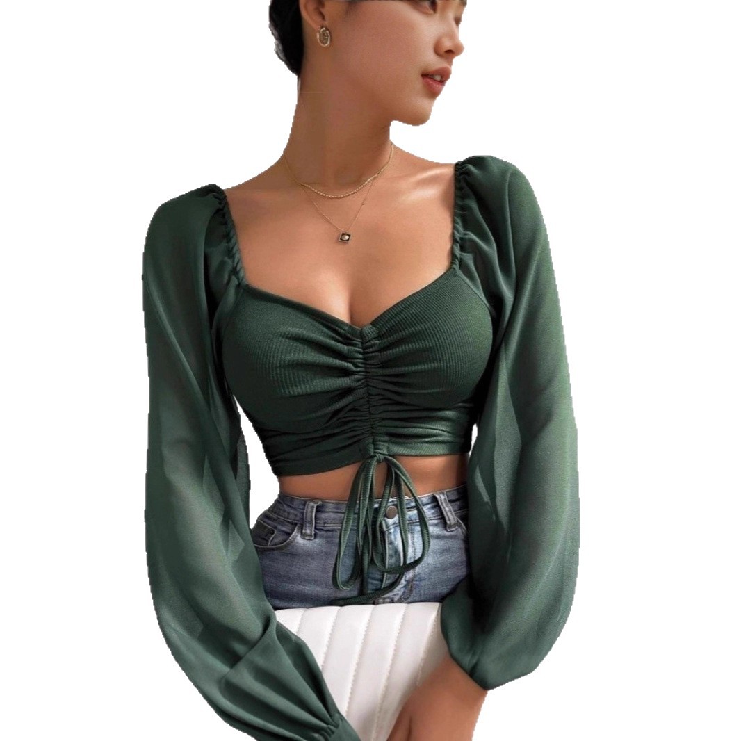 Be the first to review “Sexy and fashionable deep drawstring lace-up low-cut chiffon patchwork short long-sleeved top”