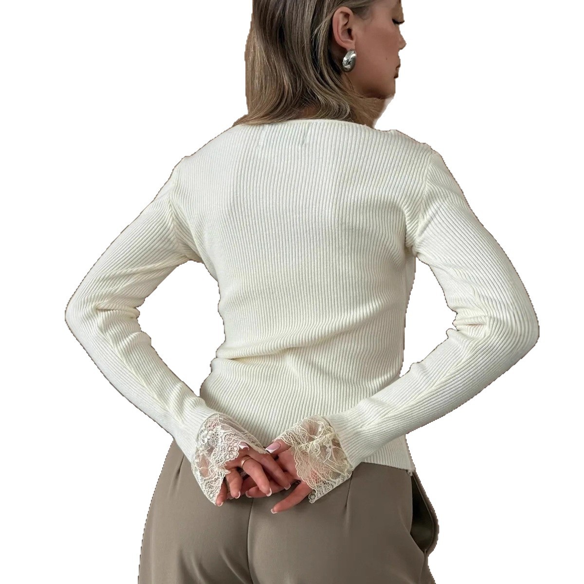 Sexy and fashionable lace stitching bow decoration long-sleeved basic round neck pullover top