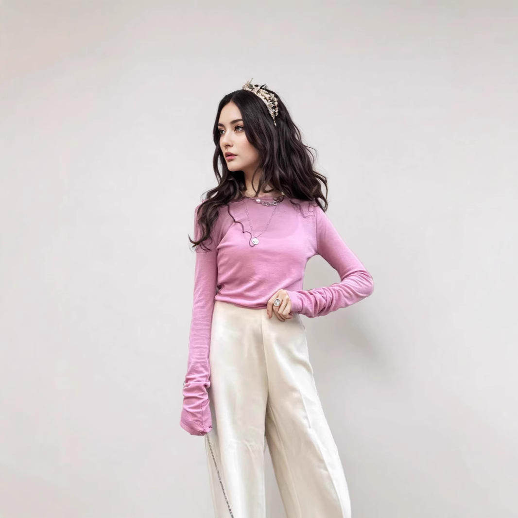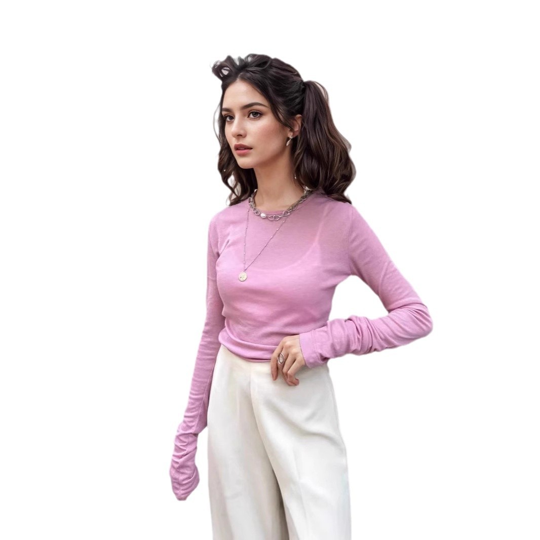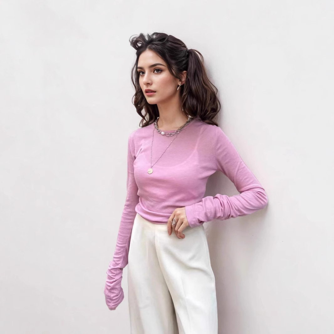 Simple and versatile thin Tencel bottoming shirt, round neck, piled sleeves, slim top, worn inside and outside, long sleeves