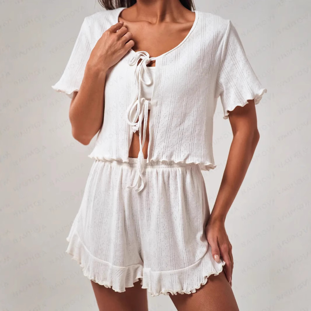 Solid color short-sleeved shorts set, sexy hollow lace-up cardigan top, ruffled pajama shorts
