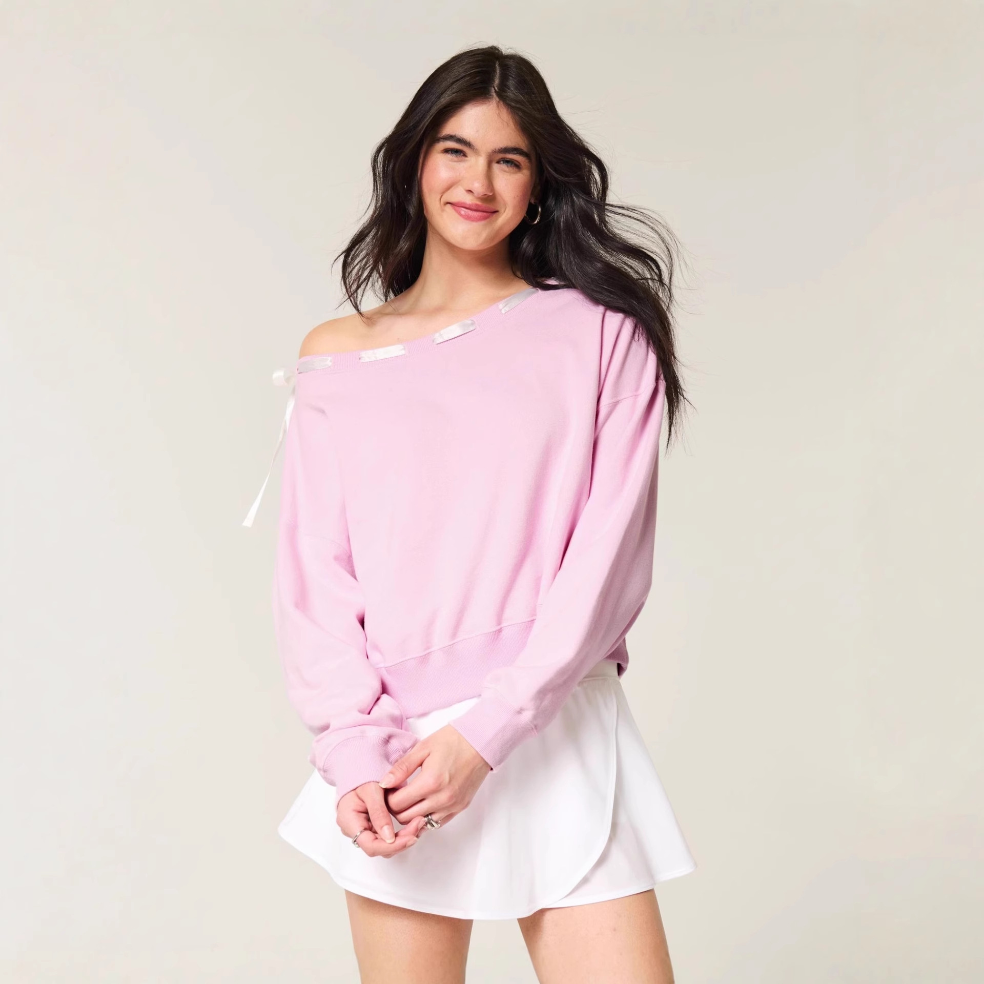 Be the first to review “Spring fashion design oblique shoulder stitching ribbon bow long sleeve top”