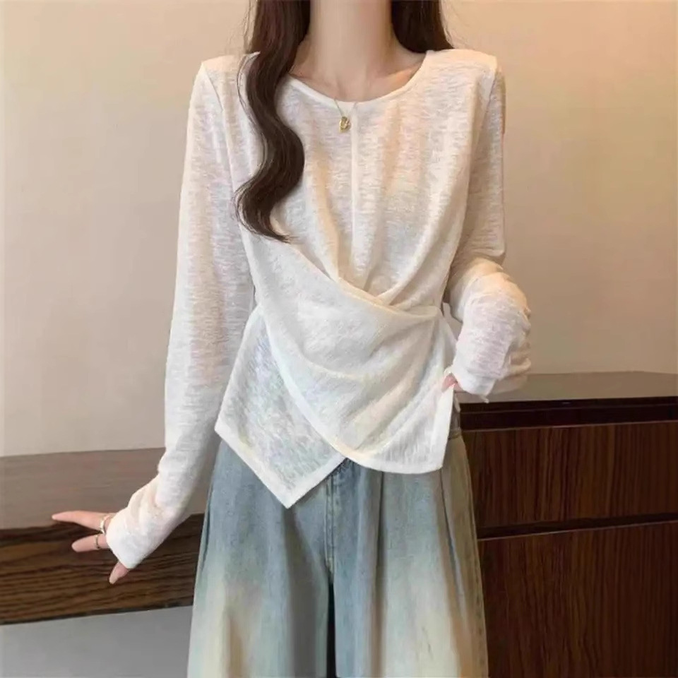 Thin, breathable and comfortable right shoulder long sleeve shirt for women, spring fashion shirt, irregular cross waisted top