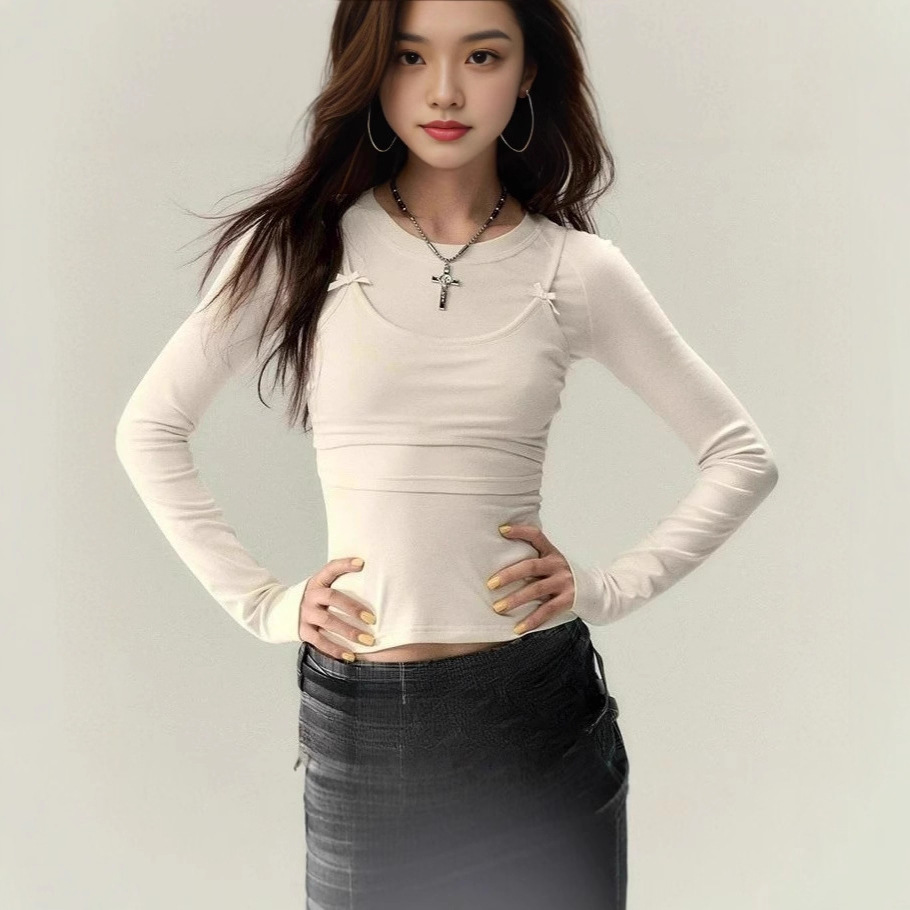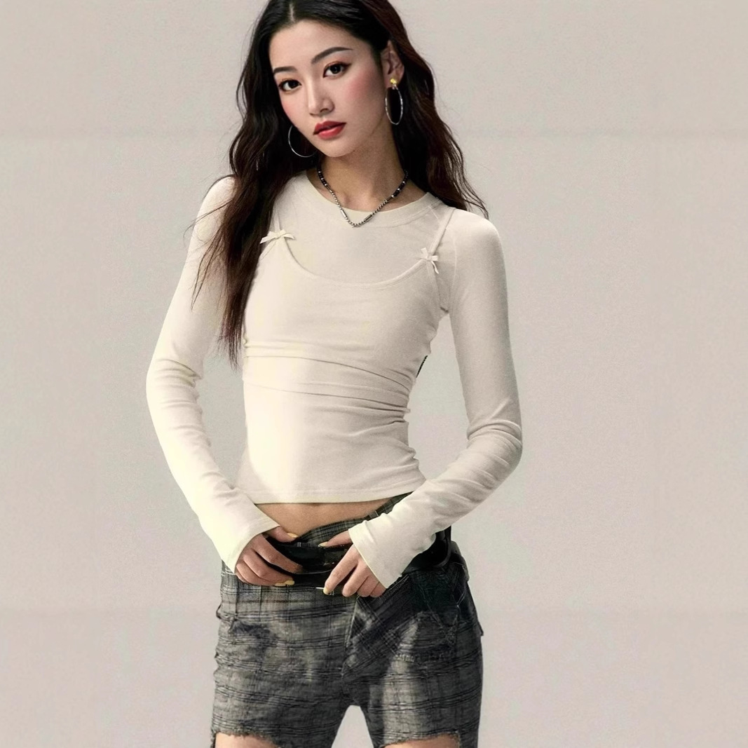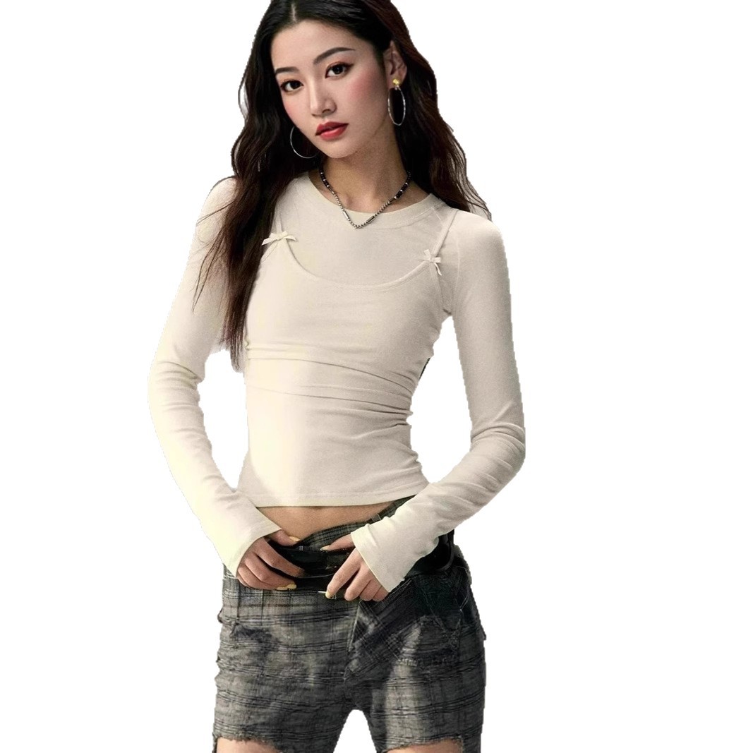 Be the first to review “Women’s Fashion Autumn Solid Color Lace Up Long Sleeve Bow Fake Two Piece Tops”