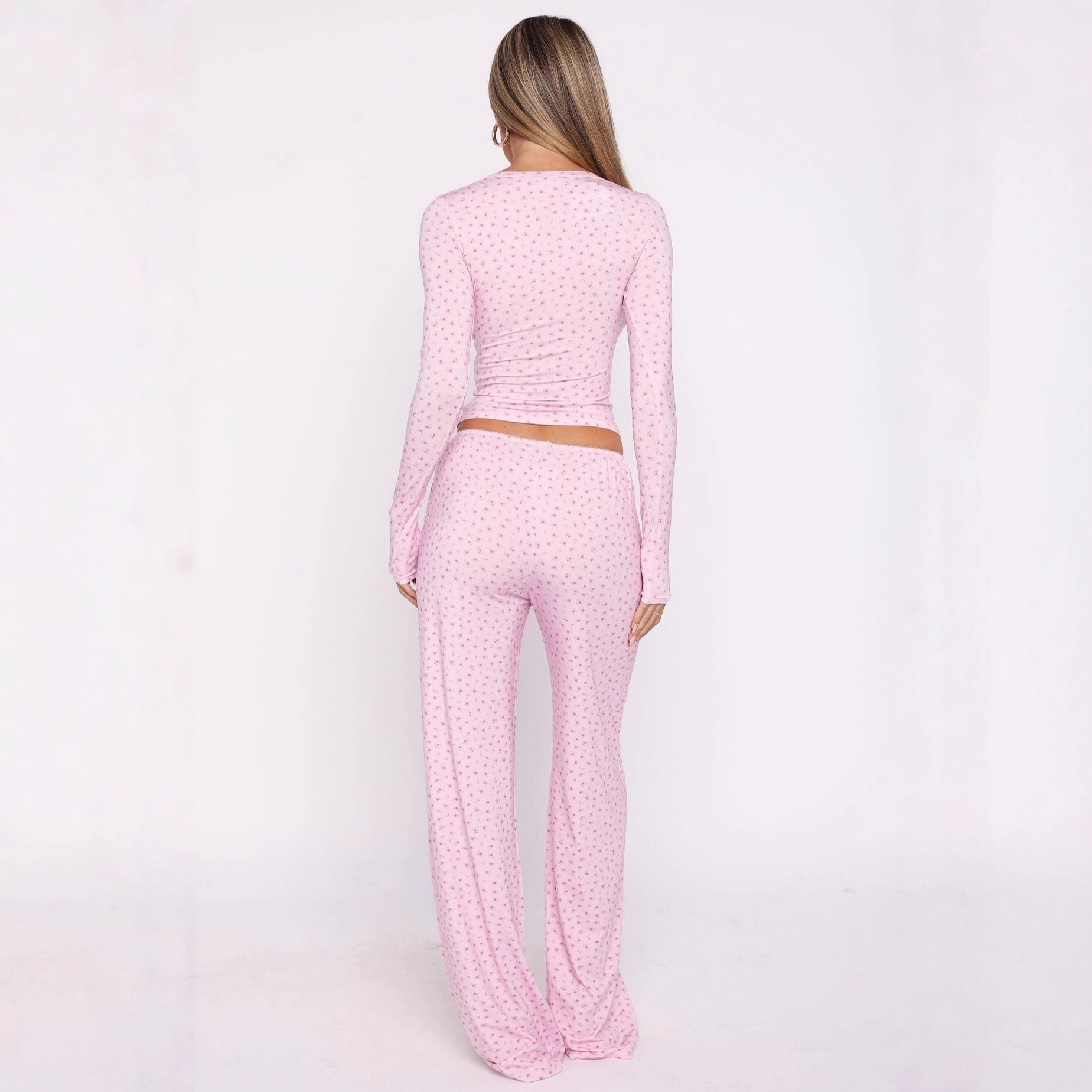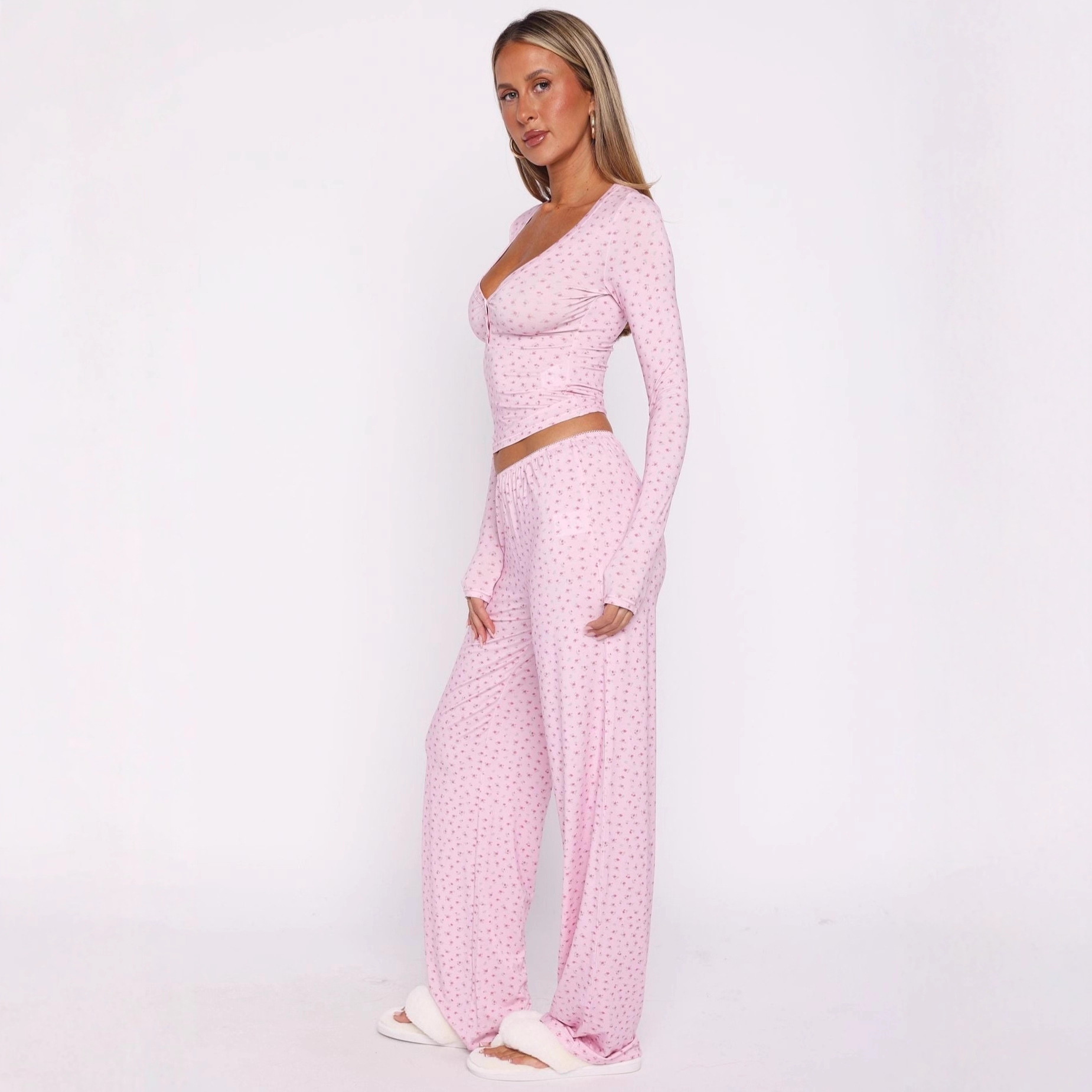 Slim-fitting women’s home wear printed collar button-down long-sleeved trousers two-piece set comfortable pajamas