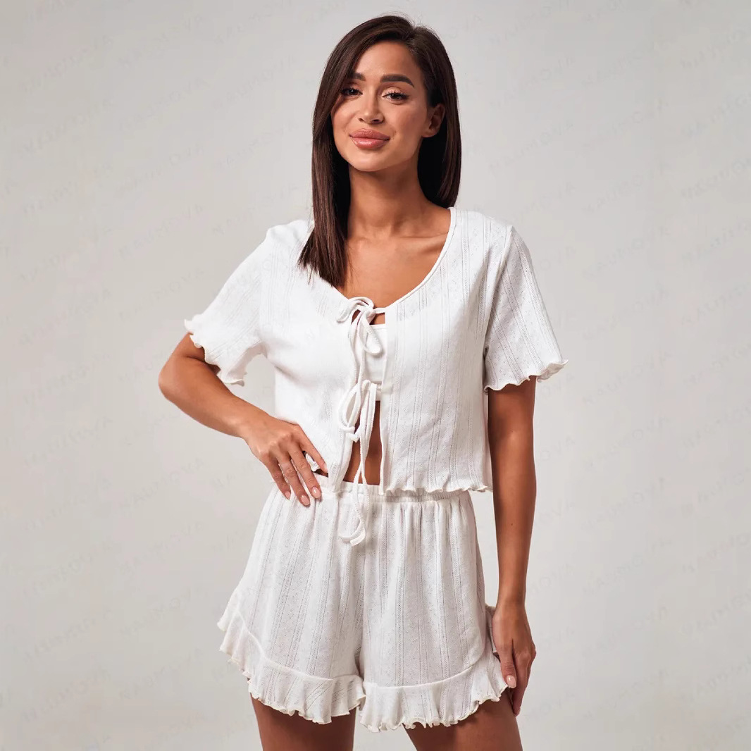 Solid color short-sleeved shorts set, sexy hollow lace-up cardigan top, ruffled pajama shorts