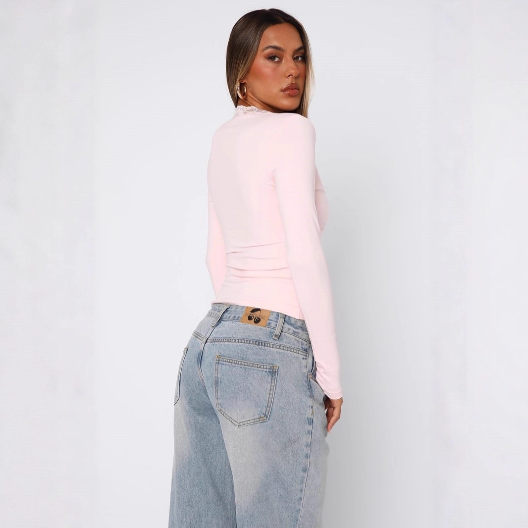 Solid color collared shirt with lace stitching, slim-fitting navel-baring long-sleeved top