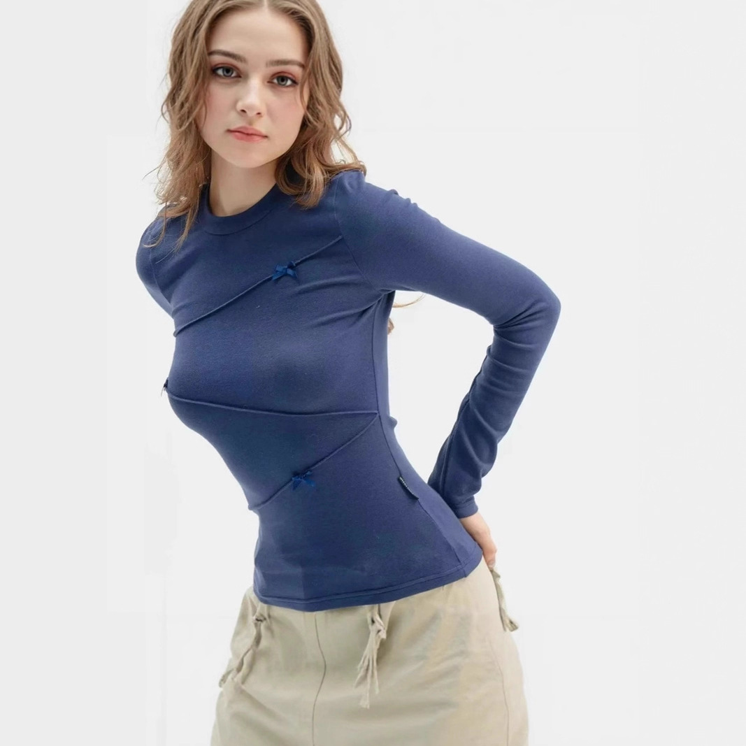 Solid color right-shoulder long-sleeved shirt for women, slim fit, asymmetric topstitch design, bow inner style, top