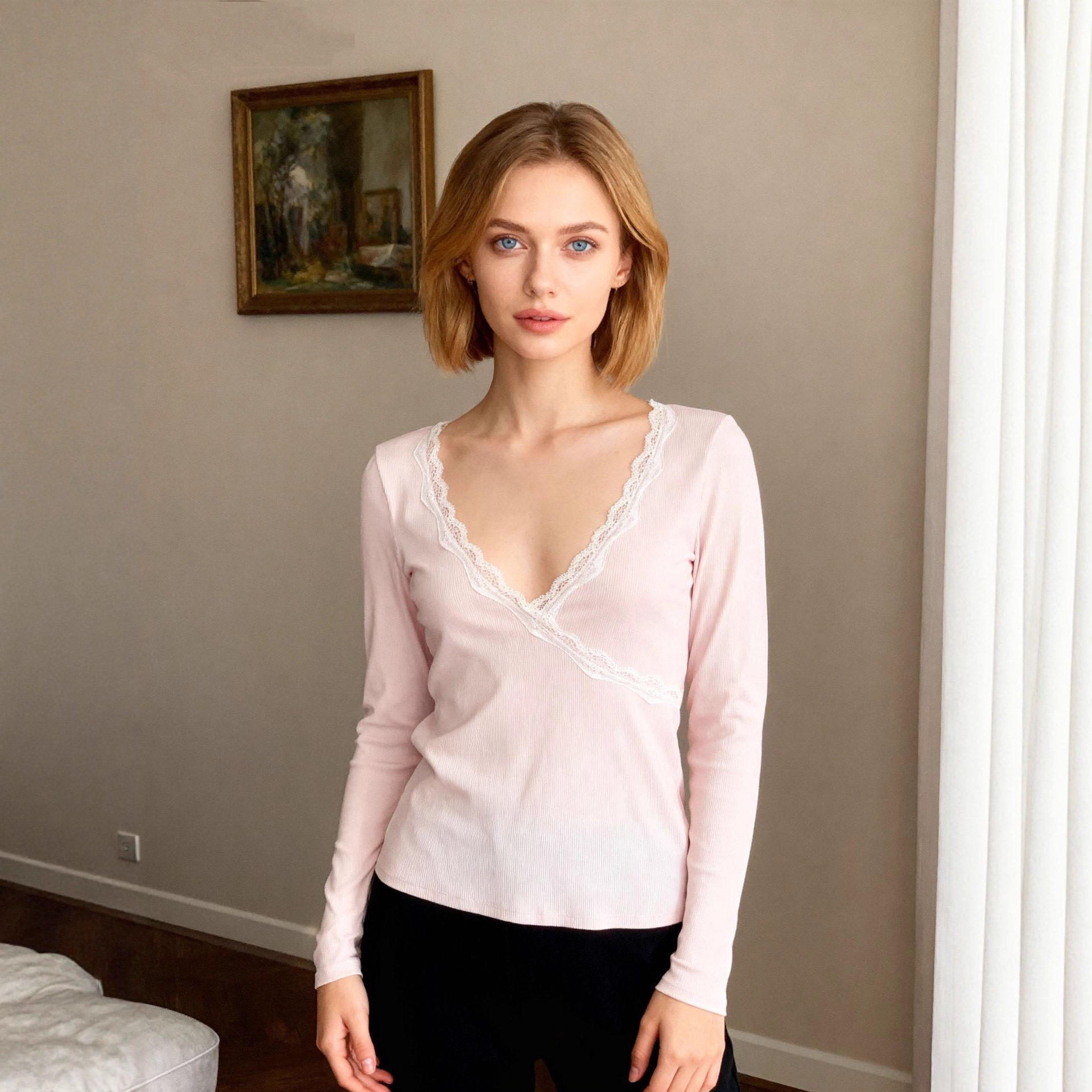 Thin long-sleeved shirt bottoming shirt fashionable lace splicing collar solid color slim fit top