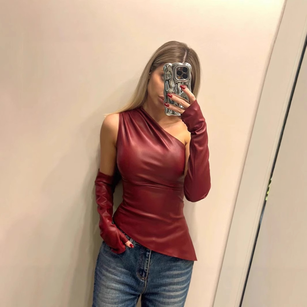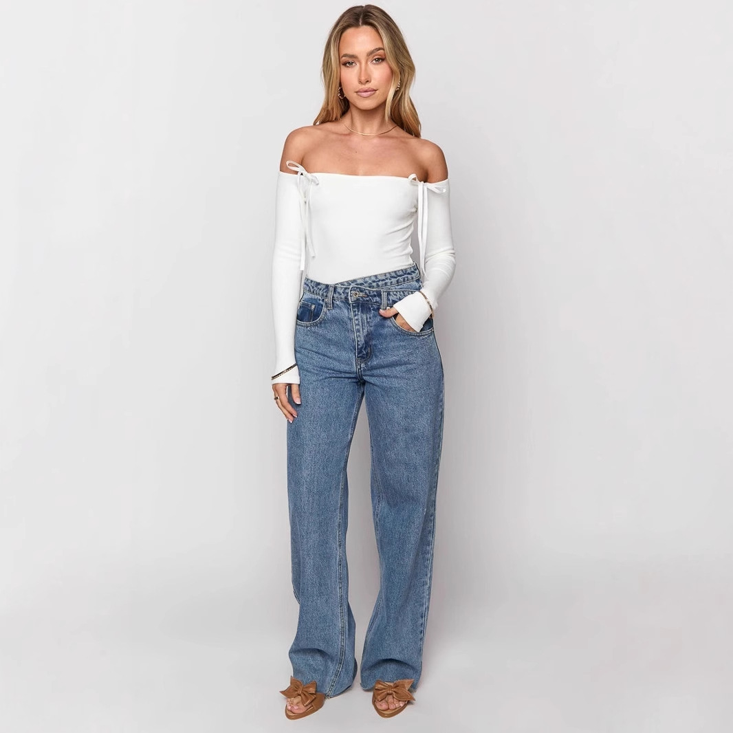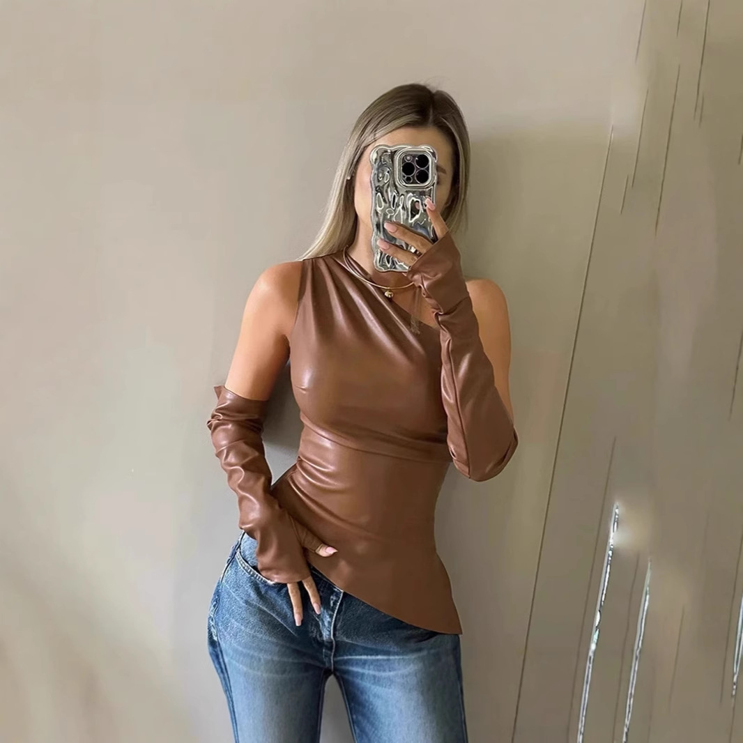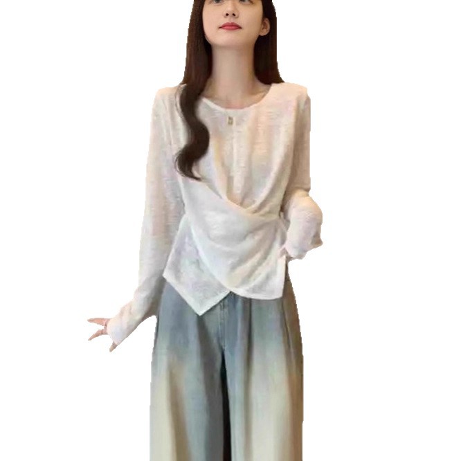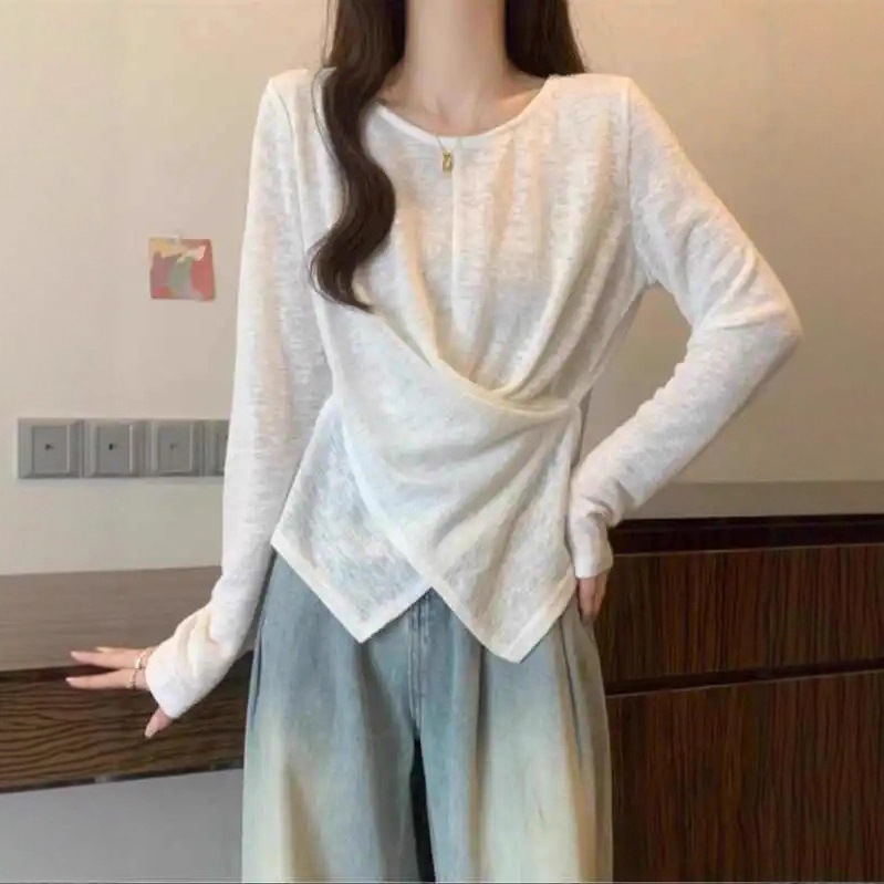 Thin, breathable and comfortable right shoulder long sleeve shirt for women, spring fashion shirt, irregular cross waisted top