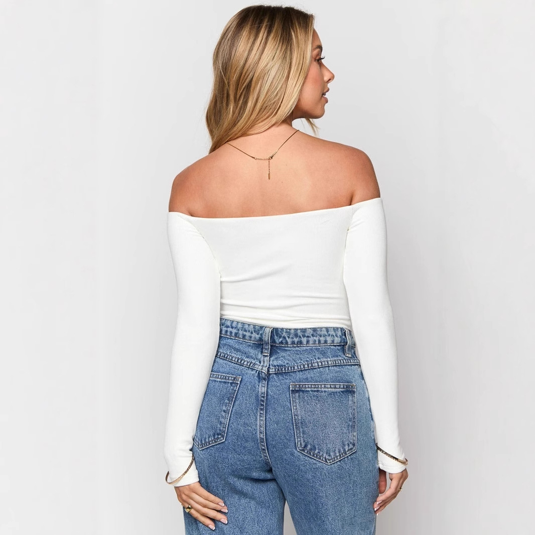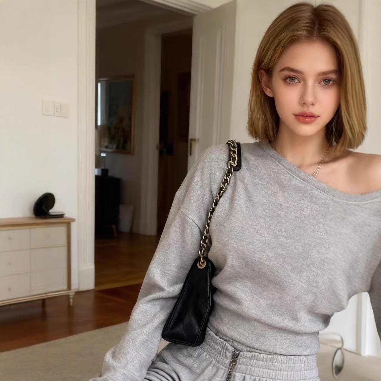 Thin loose long-sleeved shirt, fashionable and sexy slanted shoulders, exposed navel, temperament, round neck, comfortable and soft top