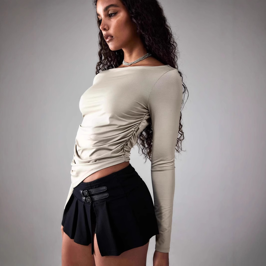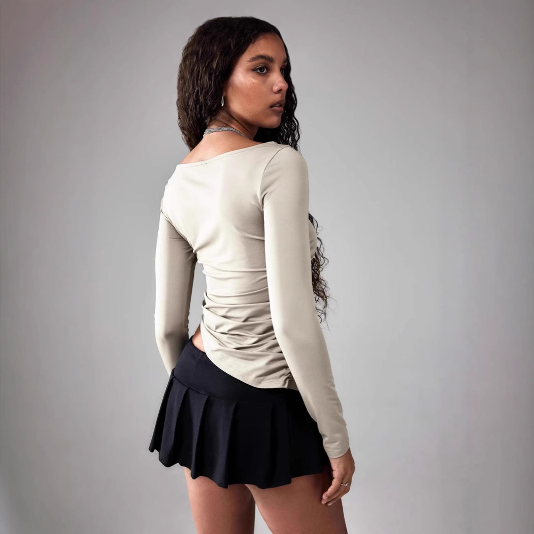 Versatile one-line collar design, pleated side waist, slimming, irregular hem, women’s long-sleeved shirt
