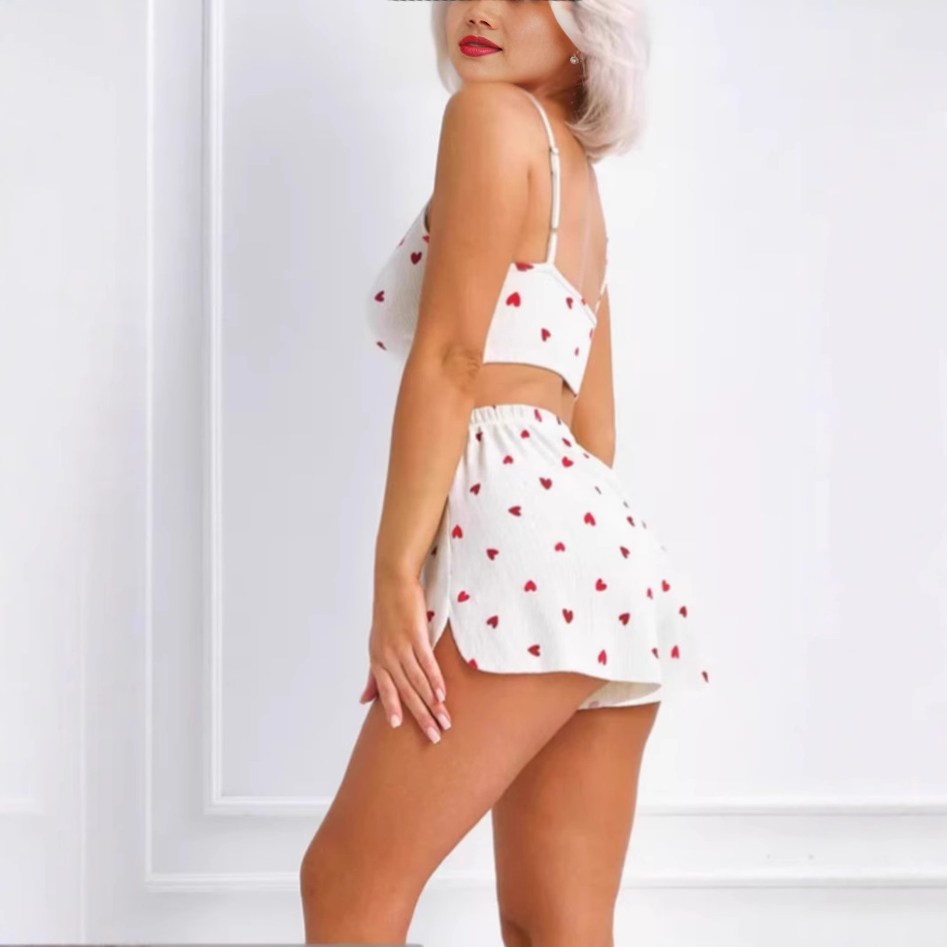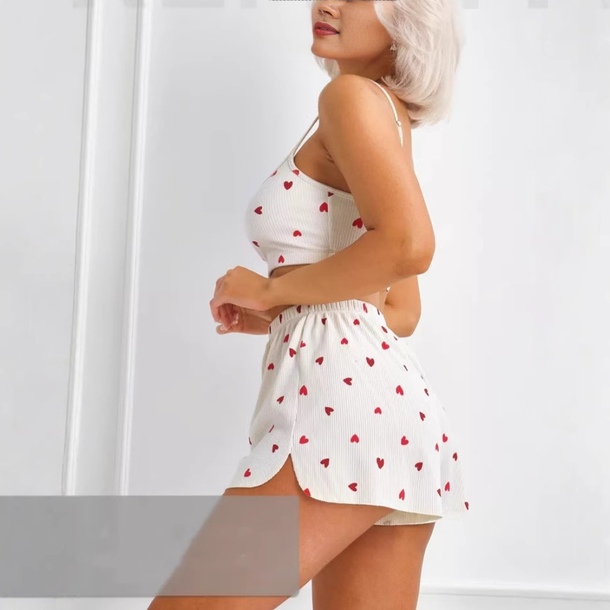 Knitted love suspender printed ribbed shorts casual loose two-piece home wear pajamas for women