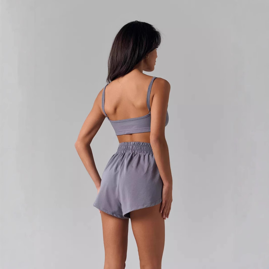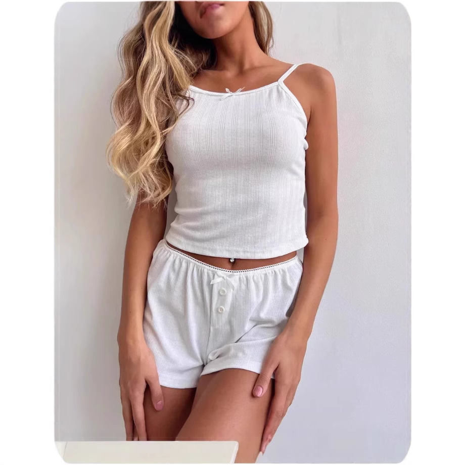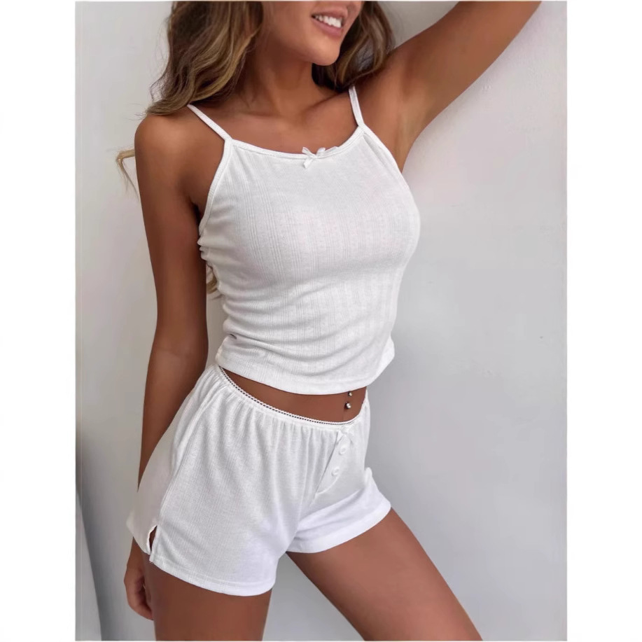 Knitted solid color suspender pajamas, slit shorts two-piece set, skin-friendly home wear for women