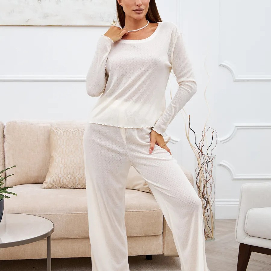 Jacquard hollow collar pajama set home wear casual loose long-sleeved trousers set
