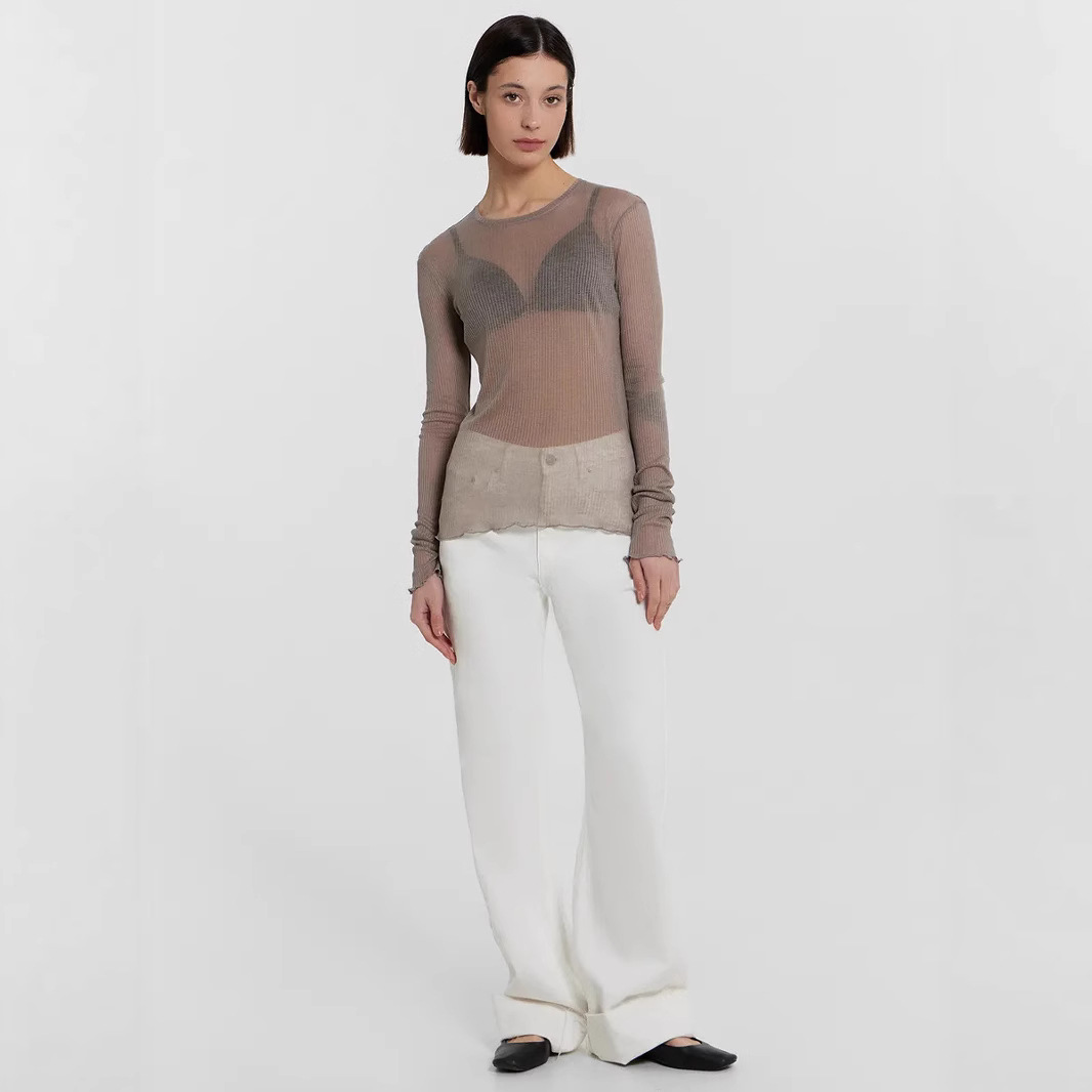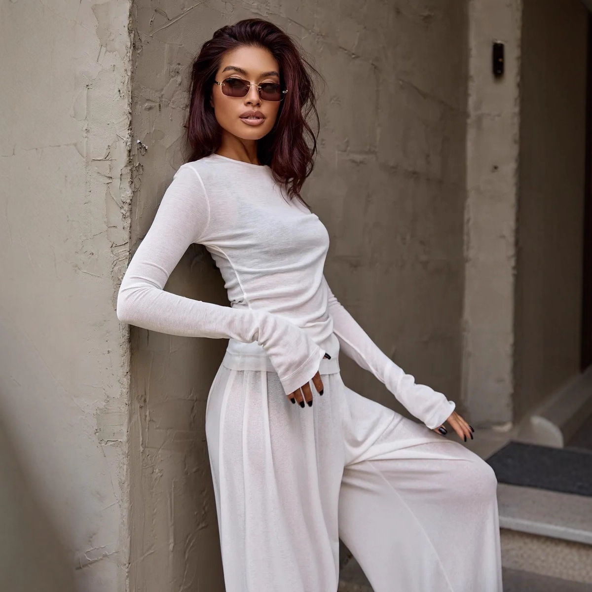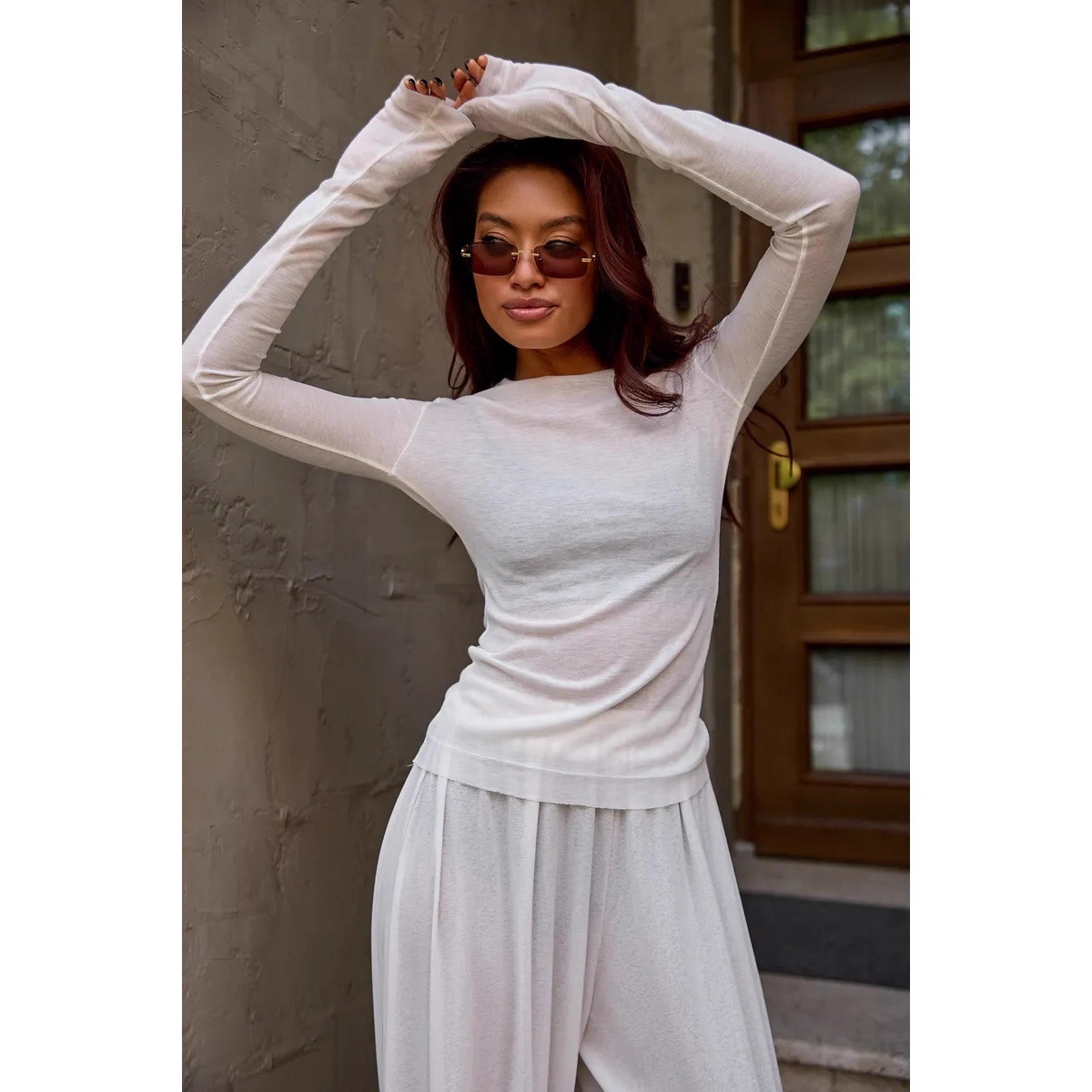 Loose, sexy and fashionable see-through thin round neck long-sleeved casual temperament shirt top