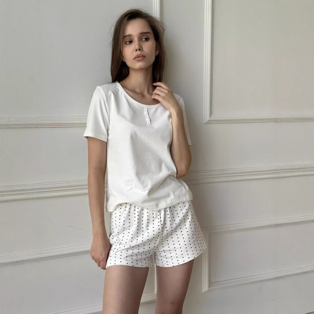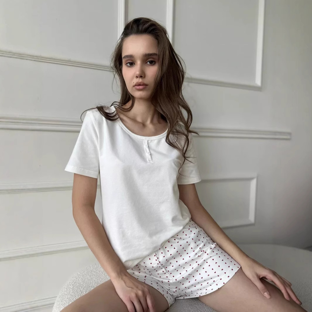 Love printed short-sleeved shorts suit with fresh style, round neck, casual and comfortable home wear and pajamas two-piece set